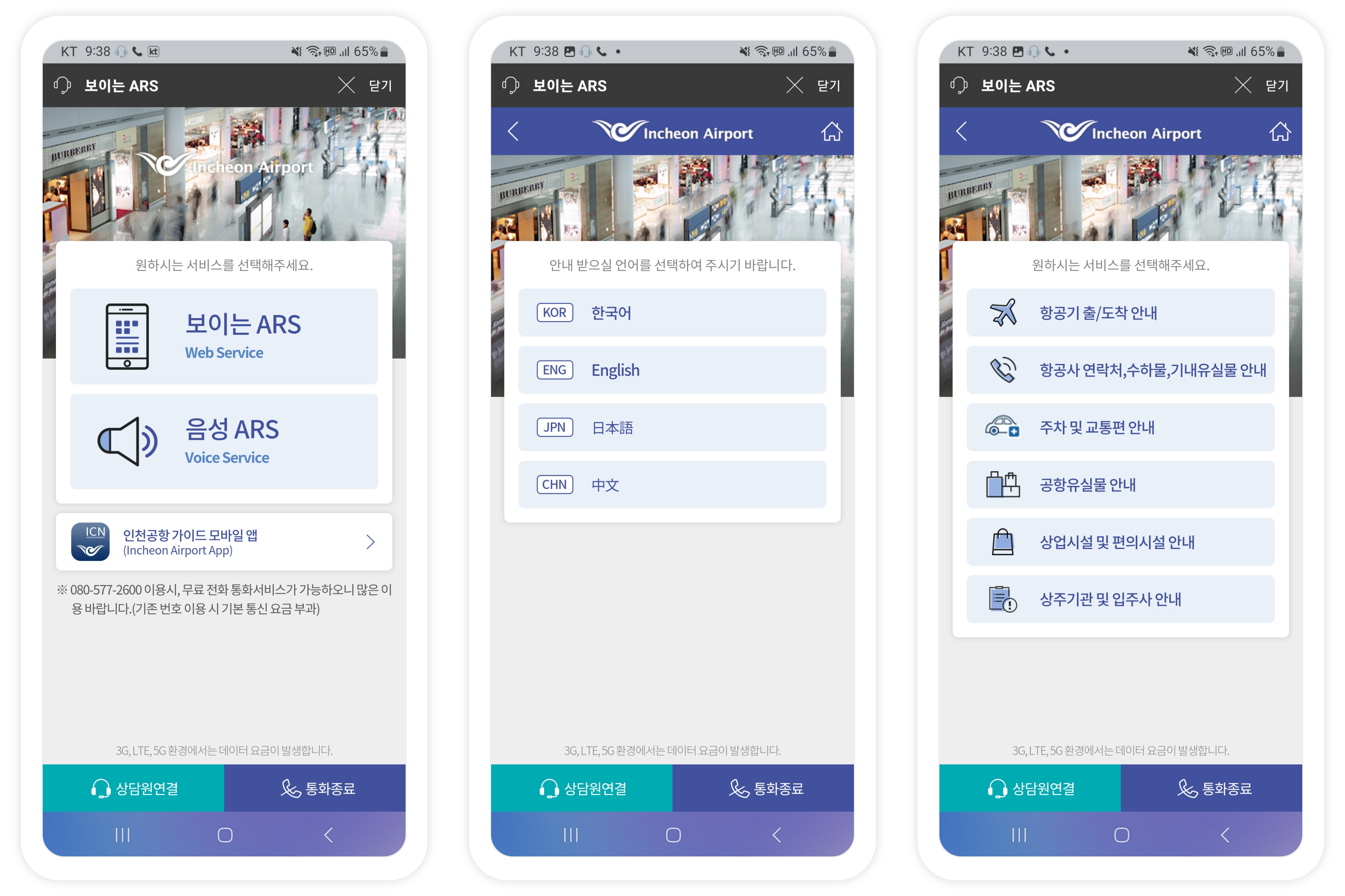 인천국제공항은 음성ARS와 동시에 화면 서비스를 제공하는 Web Voice를 도입했다. 최근 3년 간의 콜센터 안내 실적을 토대로 6가지의 대표 메뉴로 보이는ARS 첫 화면을 구성했다. ARS와 동시에 화면으로 서비스를 제공하여 음성ARS를 모두 듣지 않아도 한 눈에 메뉴를 파악하고 원하는 항목으로 진입 할 수 있다.